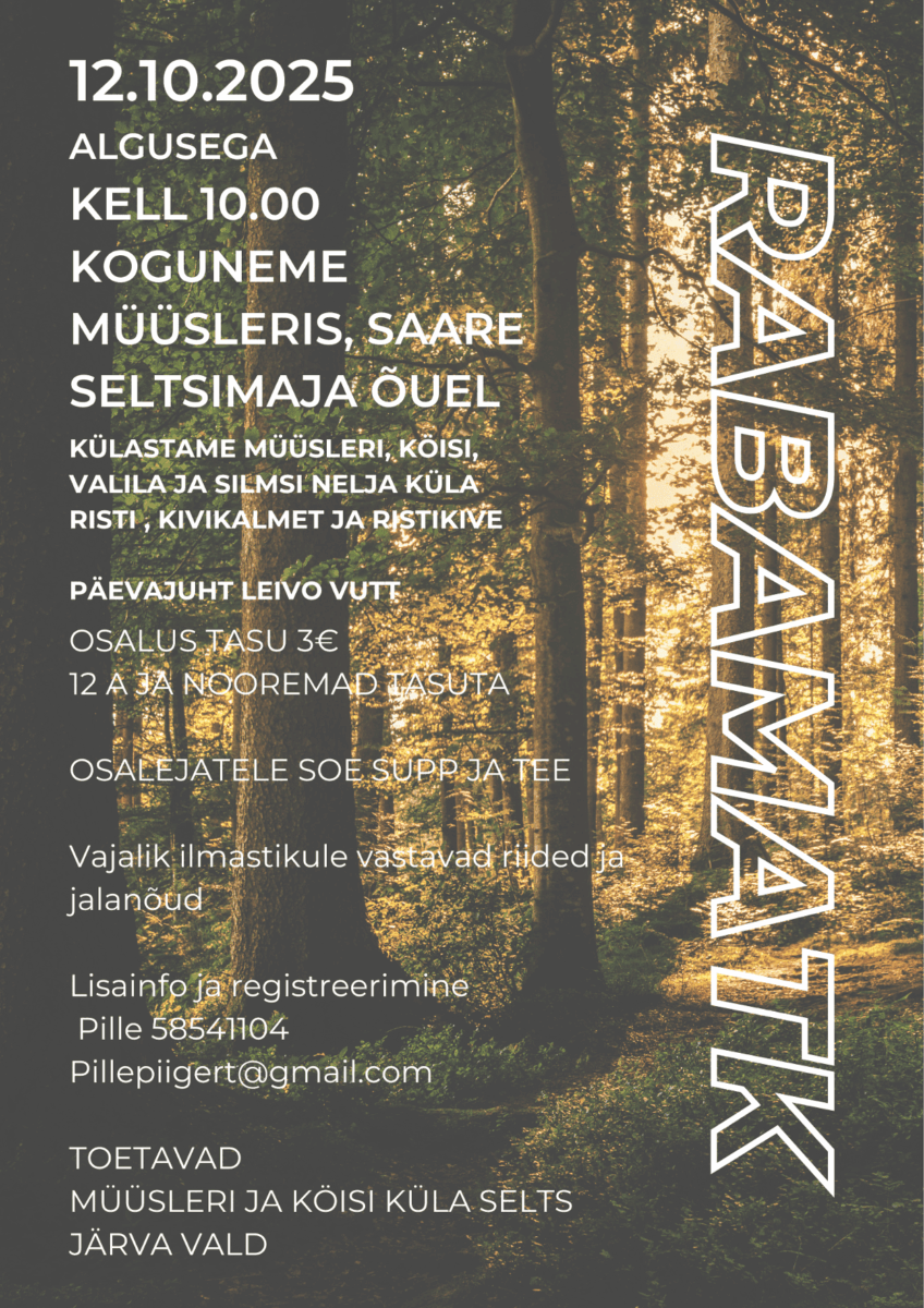 ![]() 12.10.2025 algusega 10.00 koguneme Müüsleris, Saare Seltsimaja õuel. Külastame Müüsleri, Kõisi, Valila ja Silmsi nelja küla risti, kivikalmet ja ristikive. Päevajuht Leivo Vutt Osalustasu 3€, 12A ja nooremad tasuta! Osalejatele […]