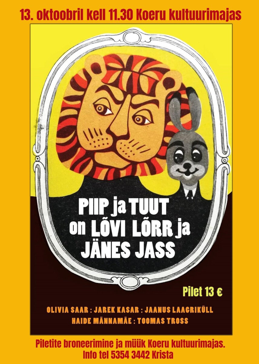 ![]() 13. oktoobril kell 11:30 Koeru kultuurimajas Piip ja Tuut on Lõvi Lõrr ja Jänes Jass. Pilet 13€ |