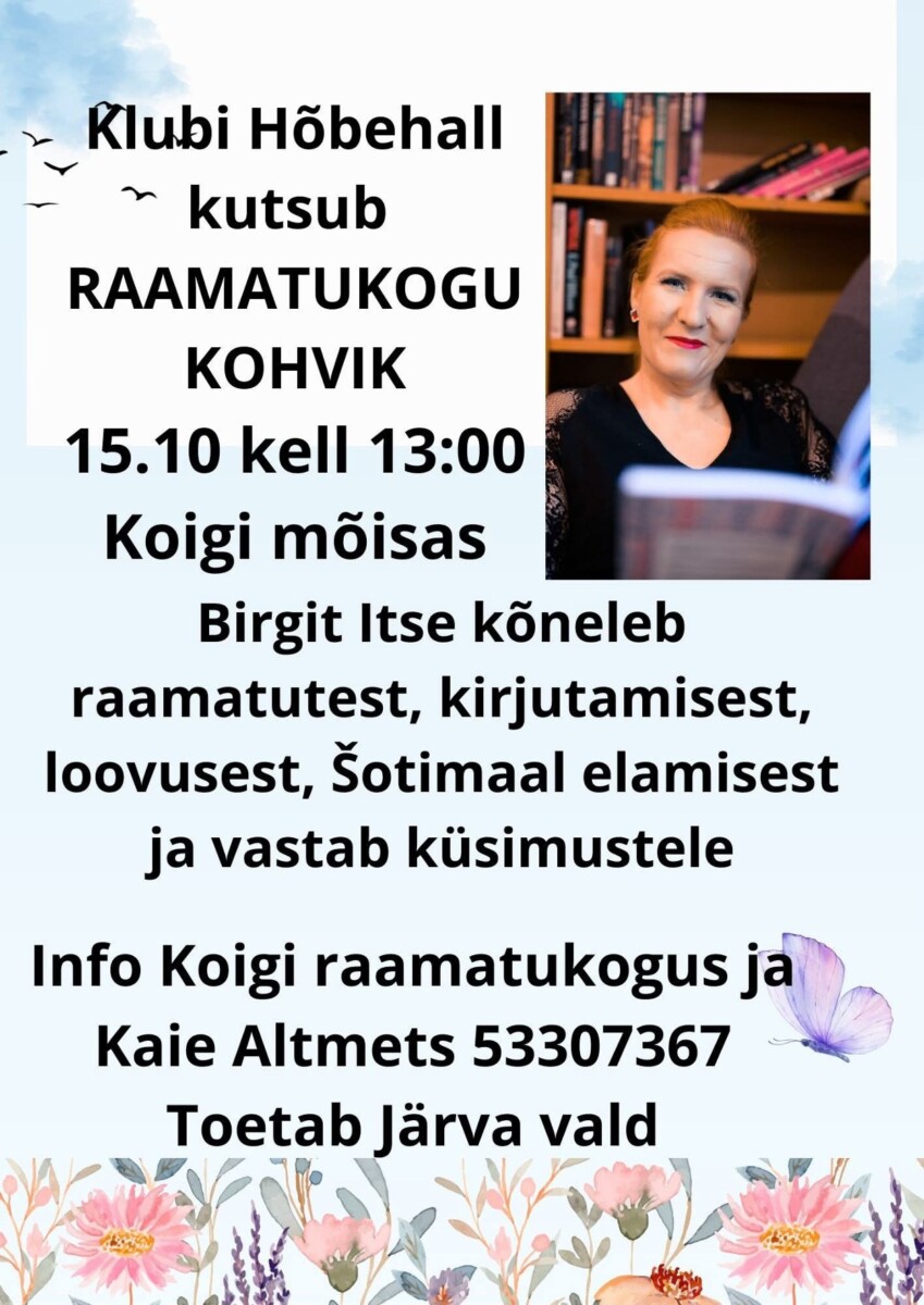![]() Klubi Hõbehall kutsub – Raamatukogu kohvik 15.10 kell 13:00 Koigi mõisas. Birgit Itse kõneleb raamatutest, kirjutamisest, loovusest, Šotimaal elamisest ja vastab küsimustele. |