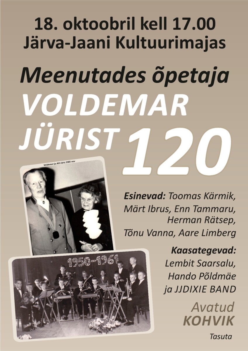 ![]() 18. oktoobril kell 17.00 Järva-Jaani kultuurimajas “Meenutades õpetaja Voldemar Jürist 120”. Esinevad: Toomas Kärmik, Märt Ibrus, Enn Tammaru, Herman Rätsep, Tõnu Vanna, Aare Limberg. Kaasategevad: Lembit Saarsalu, Hando Põldmäe ja […] |