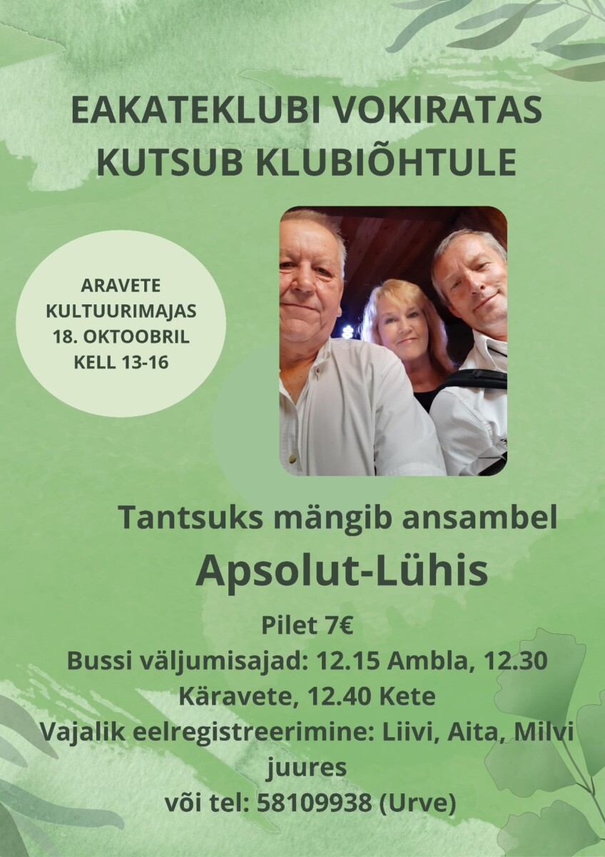 ![]() Eakateklubi Vokiratas kutsub klubiõhtule Aravete kultuurimajas 18. oktoobril kell 13-16. Tantusks mängib ansambel Apsolut-Lühis. Pilet 7€ Vajalik registreerimine (tel 5810 9938)!