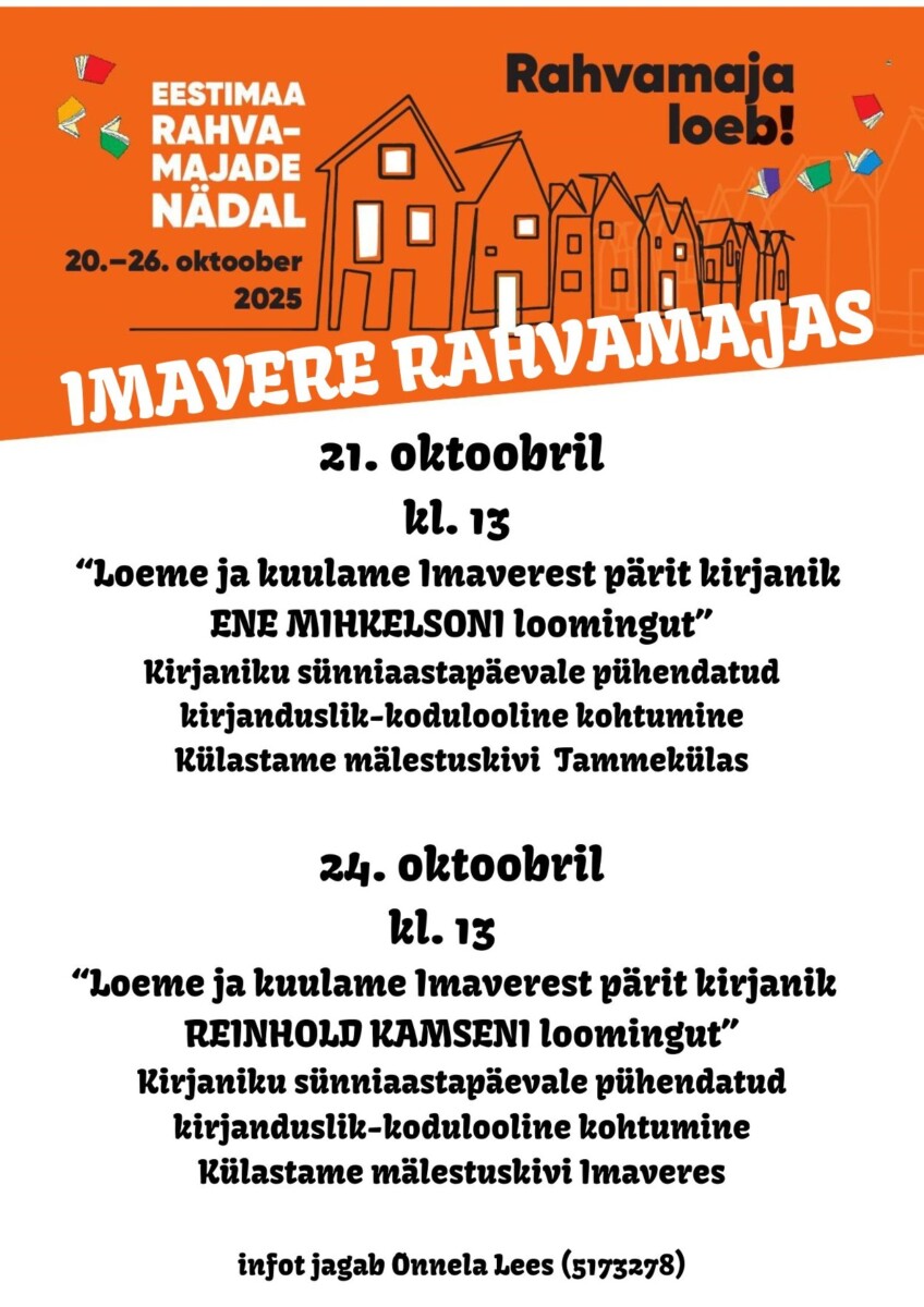 ![]() 21. oktoobril kl. 13: “Loeme ja kuulame Imaverest pärit kirjanik Ene Mihkelsoni loomingut” Kirjaniku sünniaastapäevale pühendatud kirjanduslik-kodulooline kohtumine. Külastame mälestuskivi Tammekülas. Infot jagab Õnnela Lees (517 3278) |