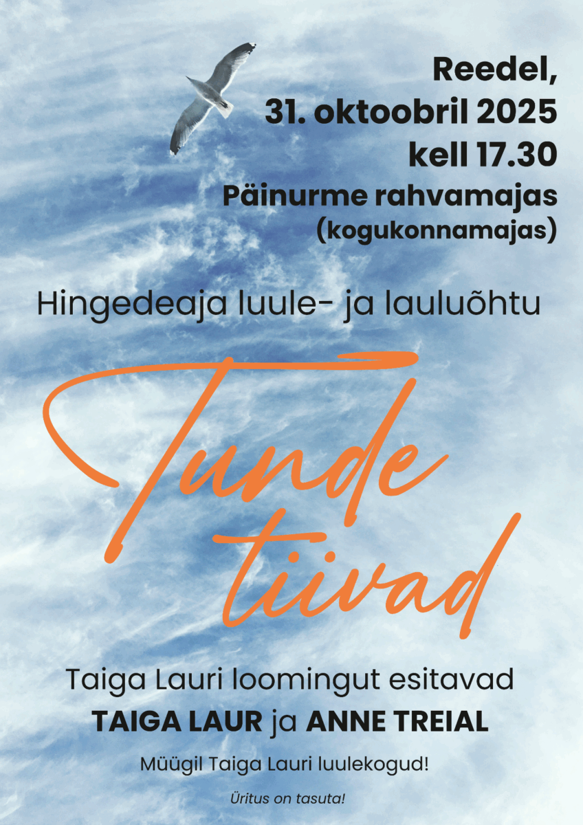 ![]() Reedel, 31. oktoobril 2025 kell 17.30 Päinurme rahvamajas hingedeaja luule- ja lauluõhtu “Tunde tiivad”. Taiga Lauri loomingut esitavad Taiga Laur ja Anne Treial.