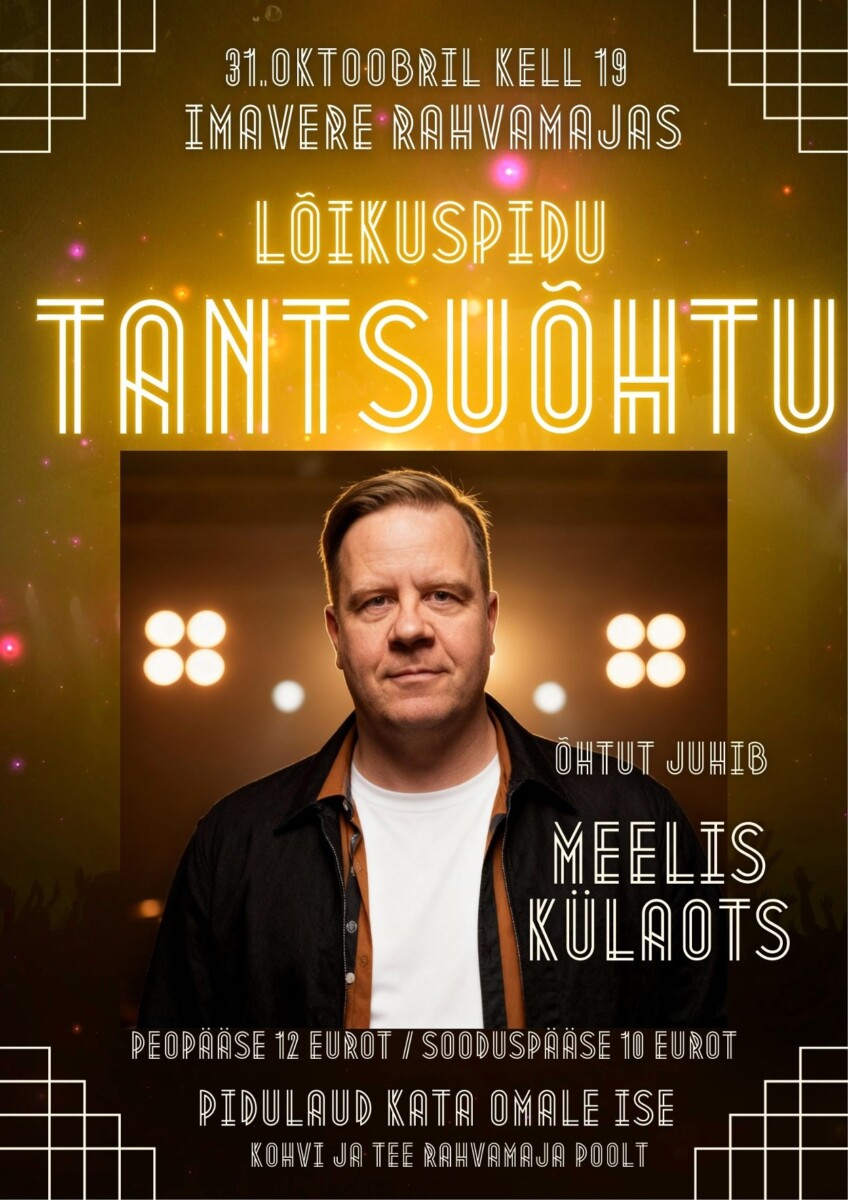 ![]() 31.oktoober kell 19 Imavere rahvamajas lõikuspidu tantsuõhtu! Õhtut juhib Meelis Külaots. Pilet 12€/sooduspääse 10€ Pidulaud kata omale ise, kohvi ja tee rahvamaja poolt! |
