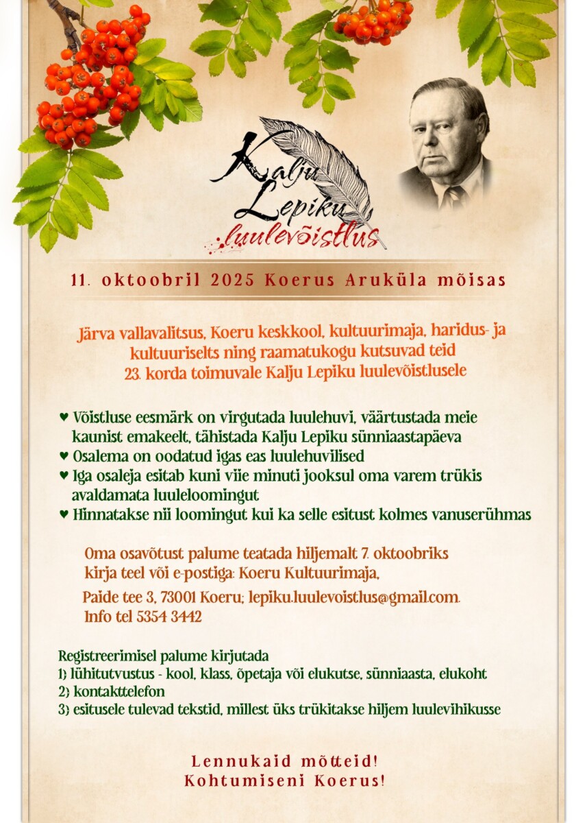 ![]() Järva vallavalitsus, Koeru keskkool, kultuurimaja, haridus- ja kultuuriselts ning raamatukogu kutsuvad teid 23. korda toimuvale Kalju Lepiku luulevõistlusele. Võistluse eesmärk on virgutada luulehuvi, väärtustada meie kaunist emakeelt, tähistada Kalju Lepiku […] |