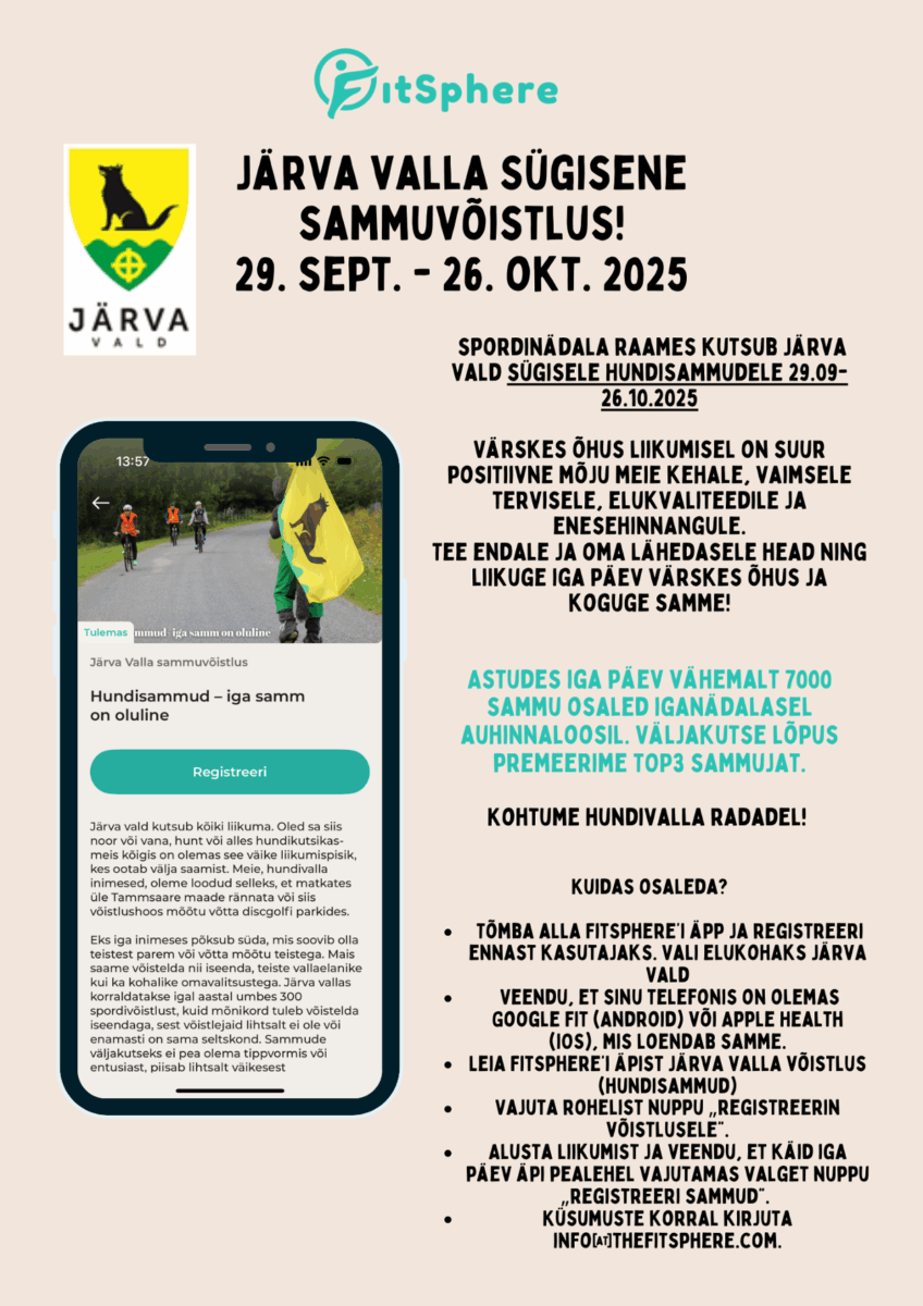 ![]() Järva valla sügisene sammuvõistlus! Spordinädala raames kutsub Järva vald sügisele hundisammudele 29.09-20.10.2025. Värskes õhus liikumisel on suur positiivne mõju meie kehale, vaimsele tervisele, elukvaliteedile ja enesehinnangule. Tee endale ja oma […] |