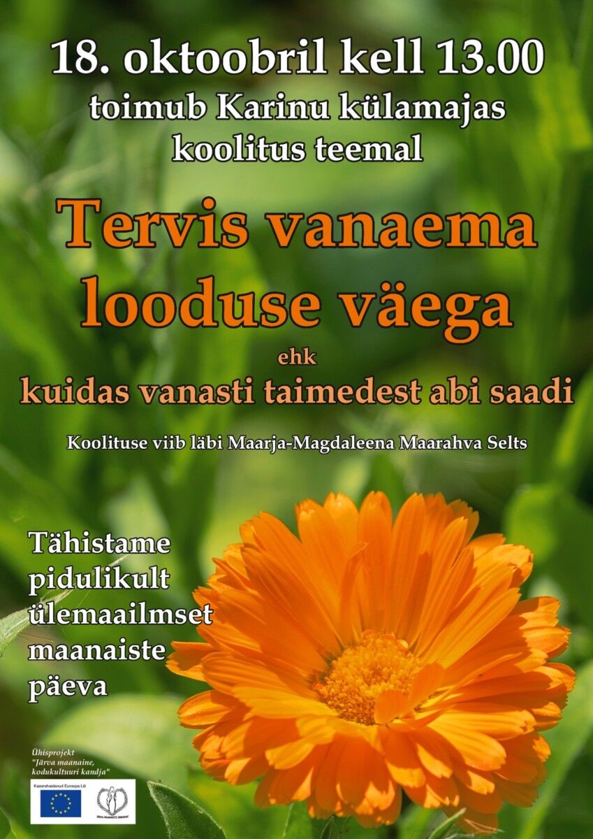 ![]() 18. oktoobril kell 13.00 toimub Karinu külamajas koolitus teemal “Tervis vanaema looduse väega” ehk kuidas vanasti taimedest abi saadi. Koolituse viib läbi Maarja-Magdaleena Maarahva Selts. Tähistame pidulikult ülemaailmset maanaiste päeva!