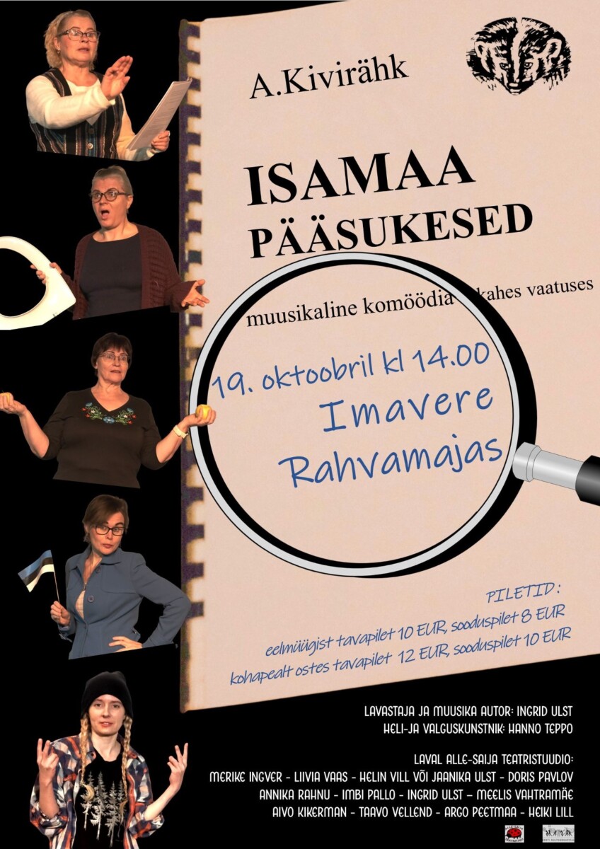 ![]() Etendus “Isamaa pääsukesed” Imavere rahvamajas 19. oktoober kell 14.00. Piletid eelmüügist tavapilet 10€, sooduspilet 8€ kohapealt ostes tavapilet 12€, sooduspilet 10€ |