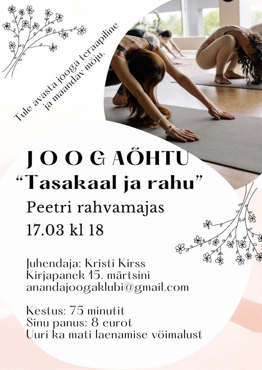 Peatus enne jõuluperioodi, kus saad aja maha võtta ning rahus ja vaikuses lõõgastuda. Tõeline restart kehale ja meelele! Kava:Kell 18.15-18.45 Aasta lõppu sobiv kirjutamishetk (kirjutise sisu jätad vaid enda teada)Kell 18.45-18.55 Vanarahva kombe kohaselt uue aasta ennustamine ehk moodne tinavalamineKell 18.55-20.10 Rahulik jooga pisikese pingutusegaKell 20.10-20.40 Meditatiivne teejoomine Eelnev joogakogemus pole vajalik. Meie imeline saal […] |