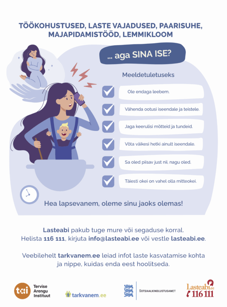 Lasteabi ja Tark Vanem kutsuvad lapsevanemaid üles sellel keerukal ajal iseennast ja oma vajadusi märkama. Oleme lapsevanemate jaoks olemas – kuulame, toetame, anname nõu ja mõtteid, kuidas oma heaolu eest hoolitseda.