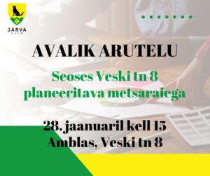 Seoses Ambla alevikus aadressil Veski tänav 8 (katastritunnus 13402:002:0290) planeeritava metsaraiega korraldab Järva vallavalitsus kolmapäeval, 28. jaanuaril kell 15 avaliku arutelu koos jalutuskäiguga Veski tn 8 katastriüksusel.