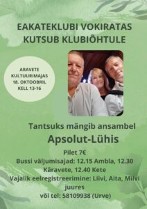 Eakateklubi Vokiratas kutsub klubiõhtule Aravete kultuurimajas 18. oktoobril kell 13-16.