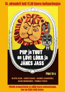 13. oktoobril kell 11:30 Koeru kultuurimajas Piip ja Tuut on Lõvi Lõrr ja Jänes Jass.