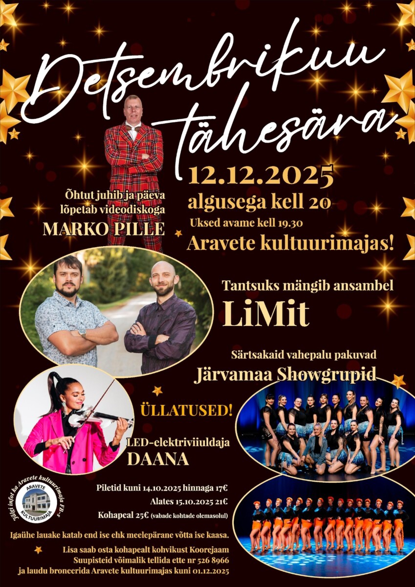![]() Detsembrikuu tähesära 12.12.2025 algusega kell 20 Aravete kultuurimajas. Uksed avame kell 19.30. Õhtut juhib ja päeva lõpetab videodiskoga Marko Pille. Tantsuks mängib ansambel LiMit. Särtsakaid vahepealu pakuvad Järvamaa Showgrupid! Piletid kuni 14.10.2025 17€. Alates 15.10.2025 21€. Kohapeal 25€. Igaühe lauake katan end ise ehk meelepärane võtta ise kaasa. Lisa saab osta kohapealt kohvikust Koorejaam. Suupisted […] |