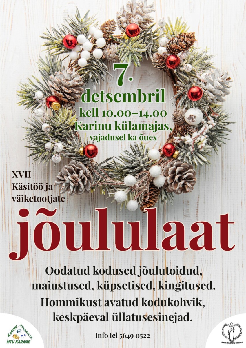 ![]() 7. detsembril kell 10.00-14.00 Karinu külamajas (vajadusel ka õues) XVII Käsitöö ja väiketootjate jõululaat. Oodatud kodused jõulutoidud, maiustused, küpsetised, kingitused. Hommikust avatud kodukohvik, keskpäeval üllatusesinejad. Info 5649 0522 |