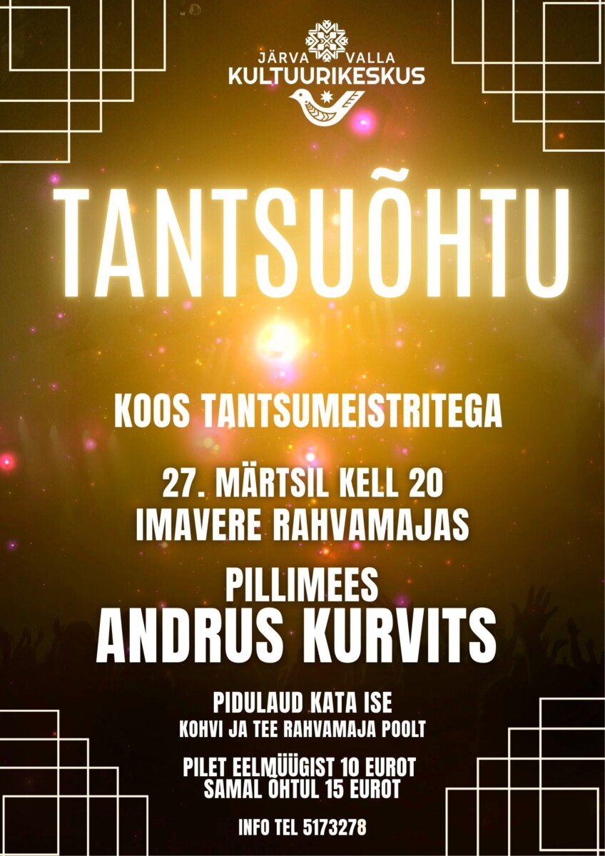 Detsembrikuu tähesära 12.12.2025 algusega kell 20 Aravete kultuurimajas. Uksed avame kell 19.30. Õhtut juhib ja päeva lõpetab videodiskoga Marko Pille. Tantsuks mängib ansambel LiMit. Särtsakaid vahepealu pakuvad Järvamaa Showgrupid! Piletid […] |